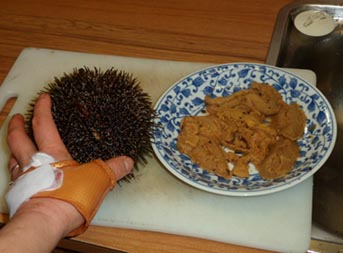 写真は、ダイビングをしてきた友人から頂いた獲れたての「うに」。私の手よりも大きなうにです。お皿に入っているのは、2個分。蒸して食べました。おいしかった~。友人に感謝!そうそう、私の手ですが、怪我をしてしまい、ただ今、固定中。ちょうどよく(?!)固定器具も、うに色。ゴールドフィンガーと呼んでいます(笑)。