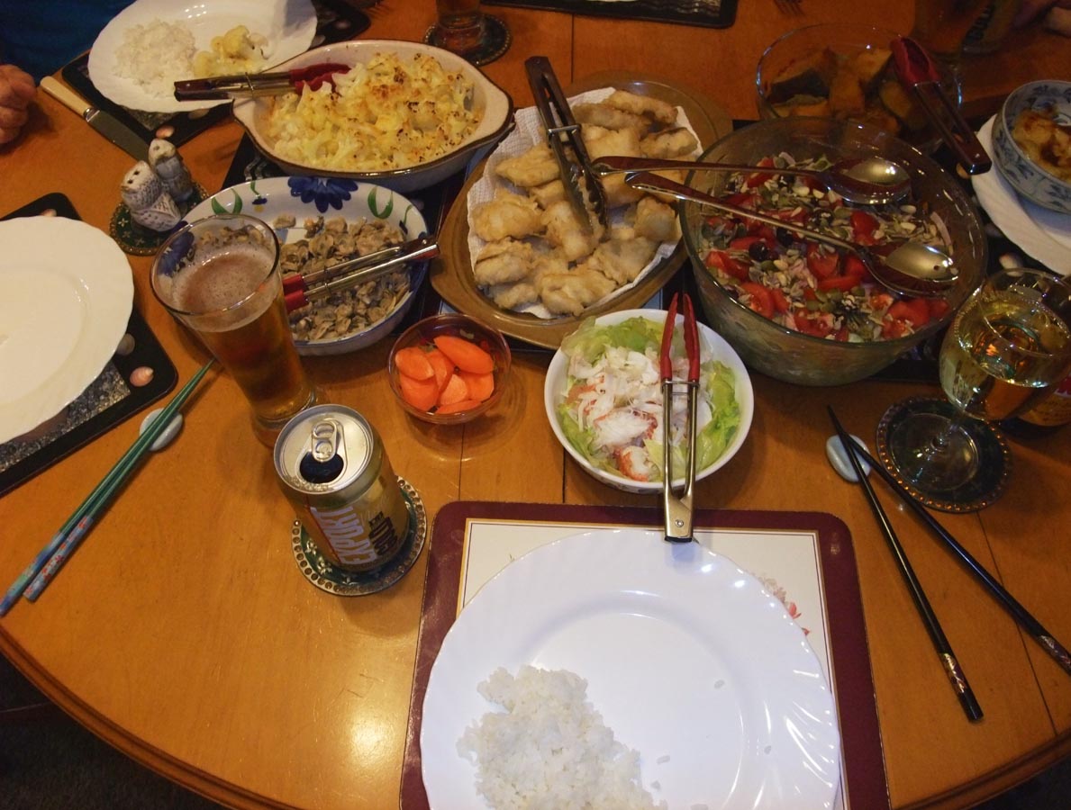 父がきていた時の食事を紹介します。今回は、タスマンの友人、シャーリー宅に4泊。シャーリー宅では、私が主に食事を用意しました。NZでは、日本と同じような食材があり、アジア食材店でみそ、しょうゆ、料理酒などもゲットできます。ということで、うちでは、NZと日本食のミックスの食事。ただ今、留守中のカイコウラの友人の”糠どこ”を預かっていまして、以下にでてくる漬物は、糠漬けです。